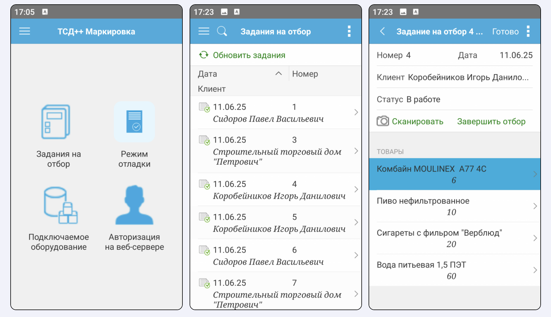 Мобильное приложение может работать как на обычных телефонах с использованием в качестве сканера камеры телефона, так и на всех моделях ТСД, где используется ОС Android.